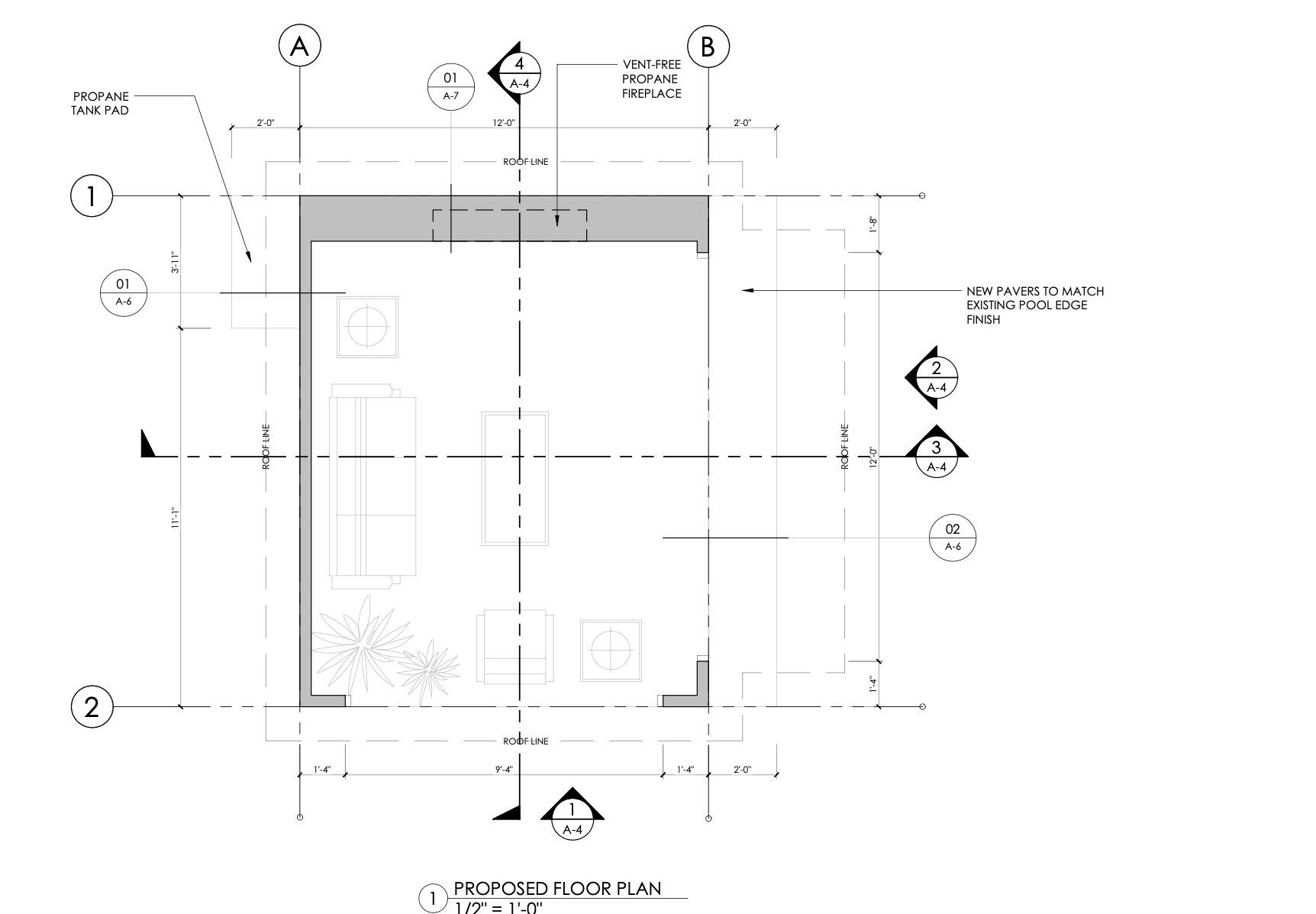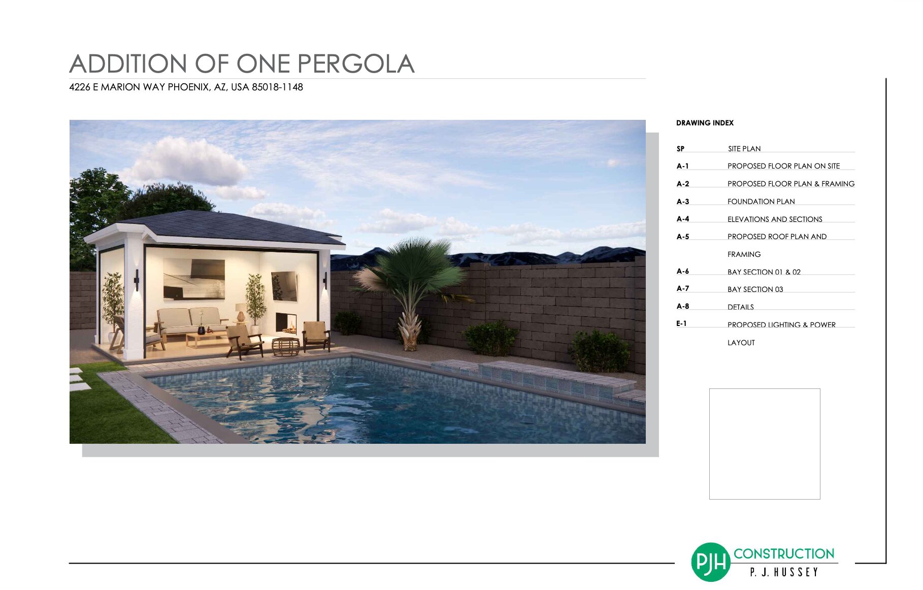 Site preparation, concrete slab and foundation, framing, roofing, and exterior finishes to construct the pergola structure and tie it seamlessly into the existing home and backyard layout.