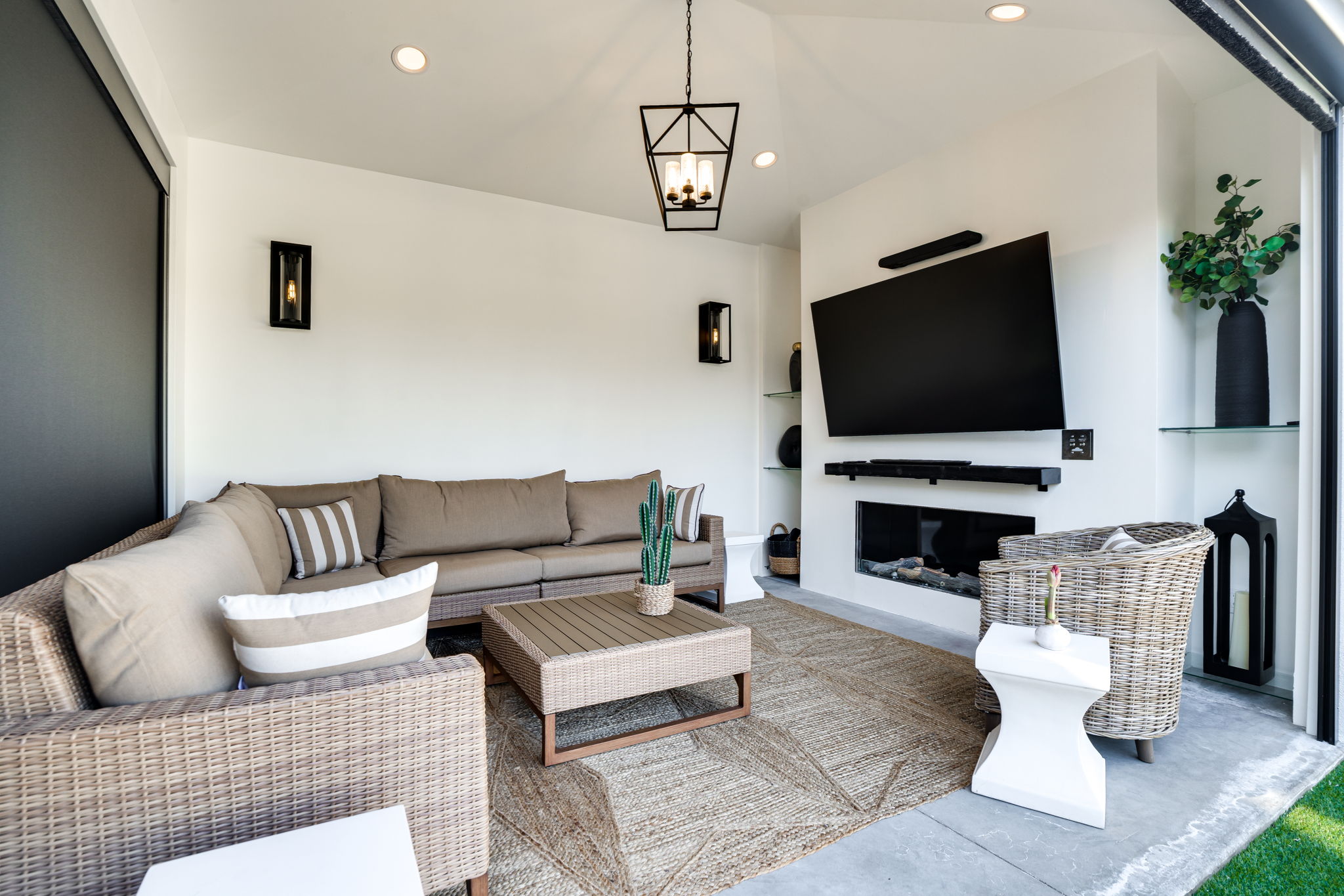 Construction of a functional outdoor lounge space including a built-in fireplace feature wall and designated mounting location for a television to create a comfortable and usable entertainment area.